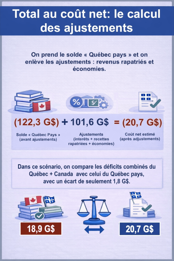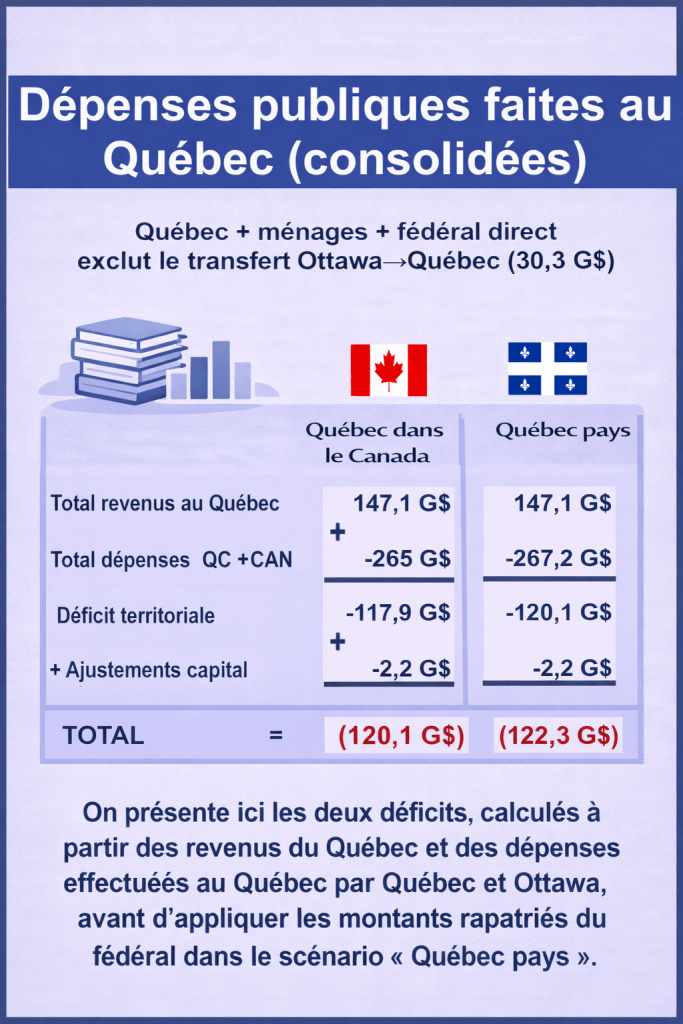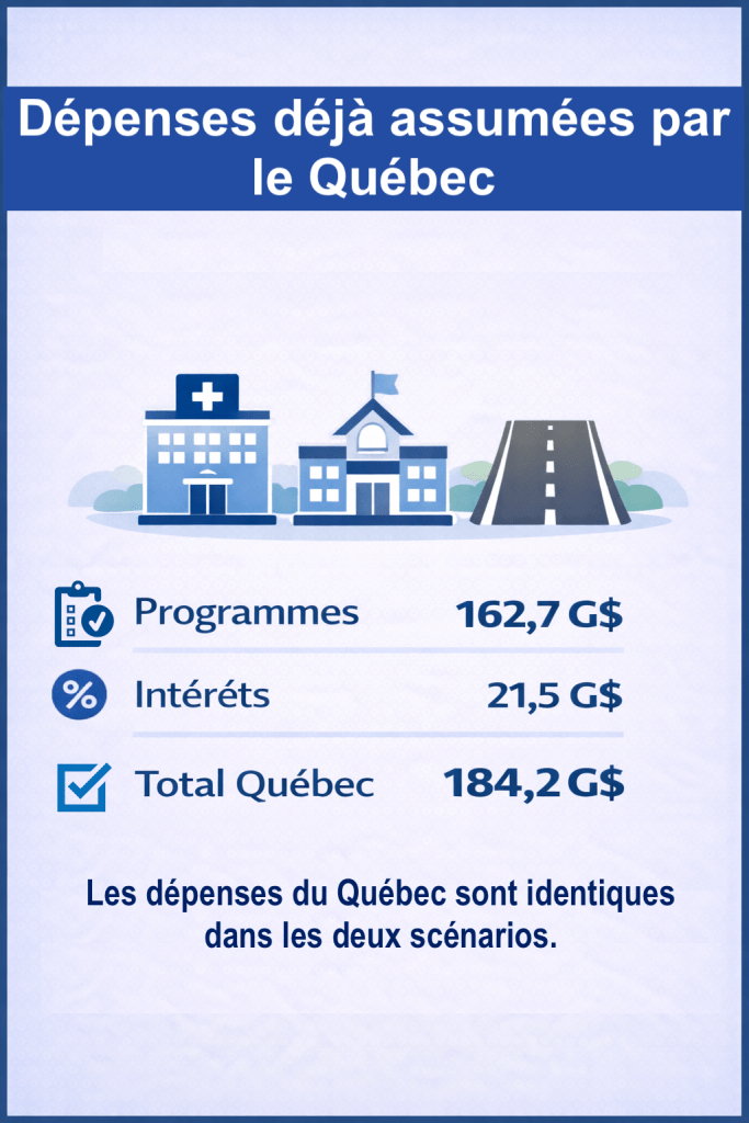 - ce qui est déjà dépensé au Québec par Ottawa (y compris les intérêts fédéraux, parce qu’ils font partie des dépenses fédérales imputées au Québec dans les comptes),